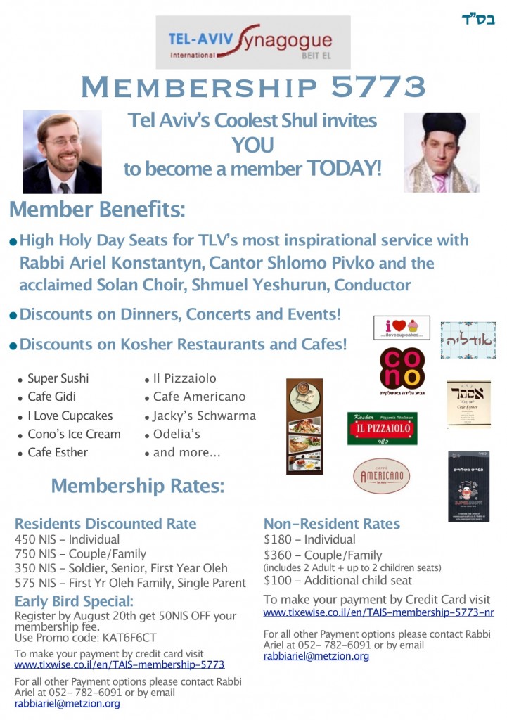 • High Holiday Seats for TLV’s most inspirational service with Rabbi Ariel, Cantor Shlomo Pivko and the acclaimed Solan Choir, Shmuel Yeshurun, Director!
