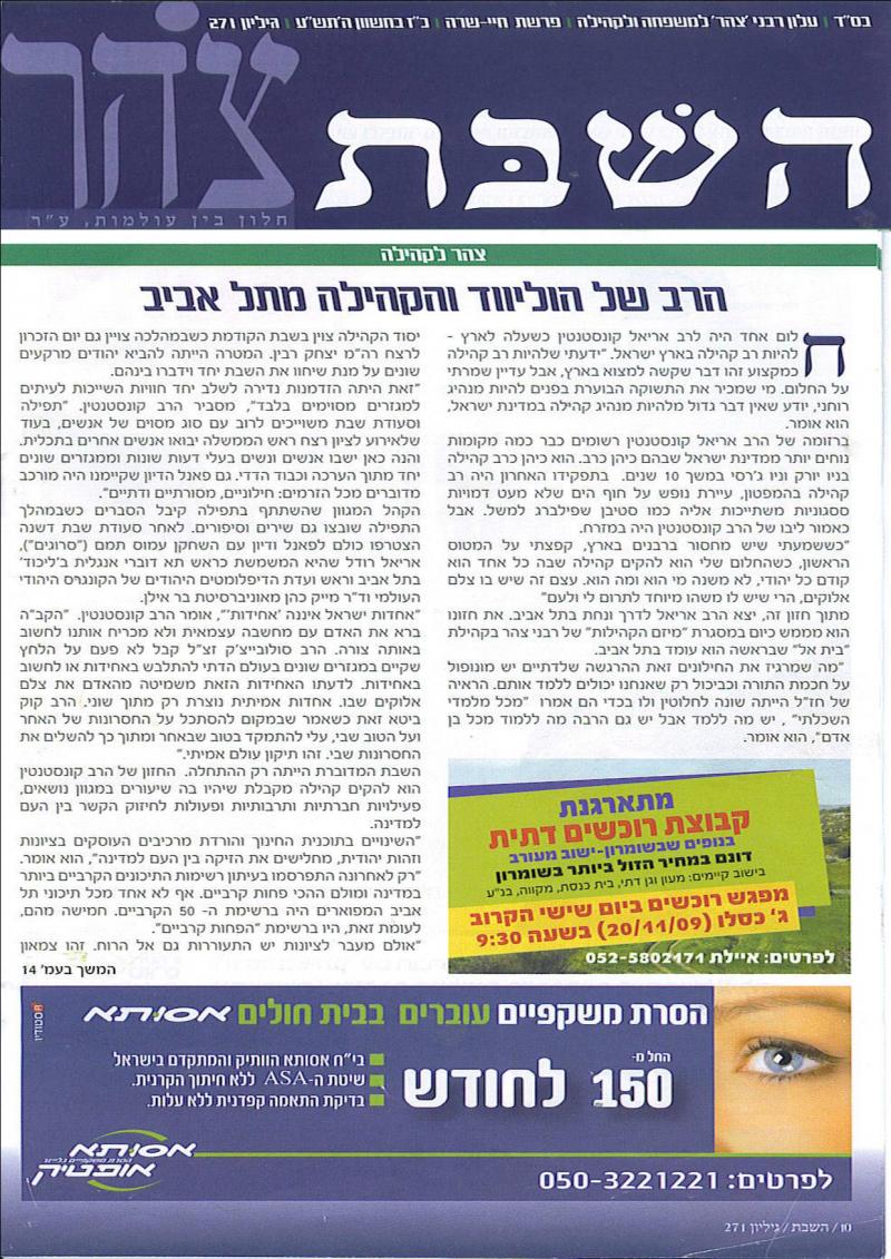 Rabbi Ariel was interviewed by the Israeli weekly, HaShabbat on the new sensation in Tel Aviv, The Tel Aviv Synagogue.